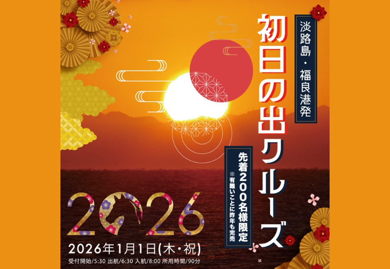 2026年1月1日(木・祝)限定で「初日の出クルーズ」を特別運航いたします。このクルーズは、国生みの島として「日本遺産」に認定されている淡路島の中でも「福良」というとても縁起の良い地名から新年をスタートしていただこうと、毎年実施している恒例の企画クルーズです。初日の出は一年で最初に目にする縁起物。2026年のみなさまの健康と幸福を願って運航いたします。