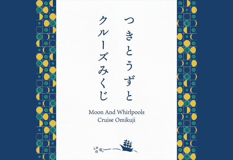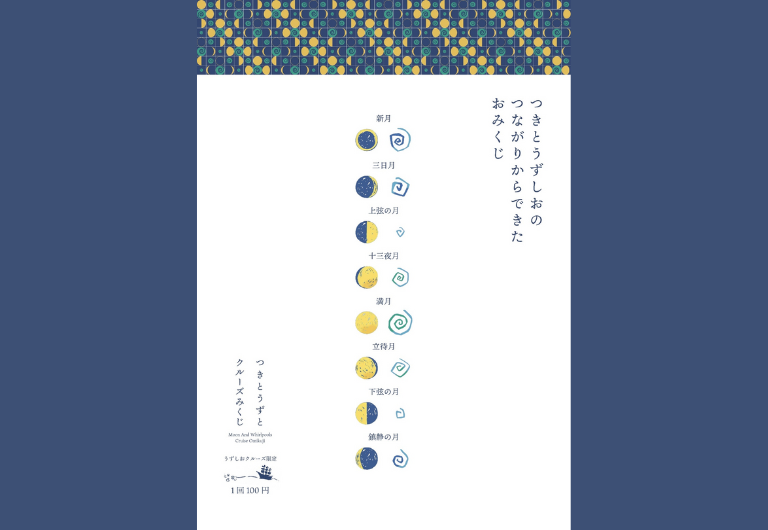鳴門海峡のうずしおには、地元の伝承に「満月と新月の日にうずしおが大きく巻き、半月の日にうずしおが小さく巻く」という言葉があります。それを月の満ち欠けと、潮の満ち引きの科学的データを元に確認し、事実だったことの驚きをデザインソースとしています。おみくじのデザインには 8 種類の月の満ち欠けに、その時に合ったうずしおの状態と自然のリズムから感じ取った言葉を綴りました。手に取りやすいおみくじという形で、淡路島ならではの自然のロマンを広く伝えることを目指しました。
