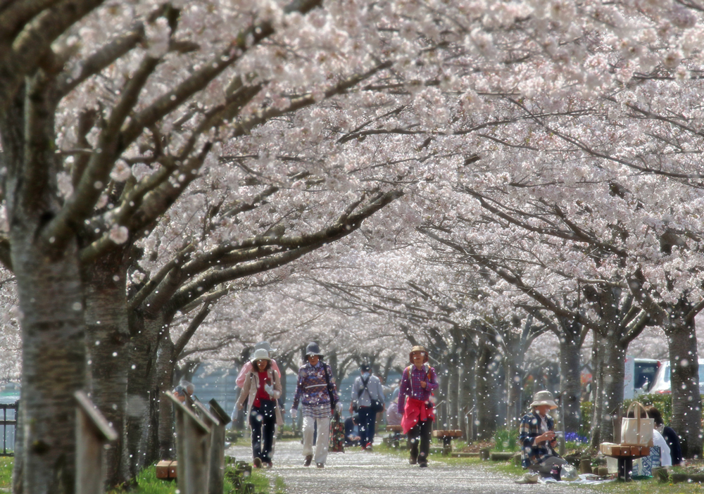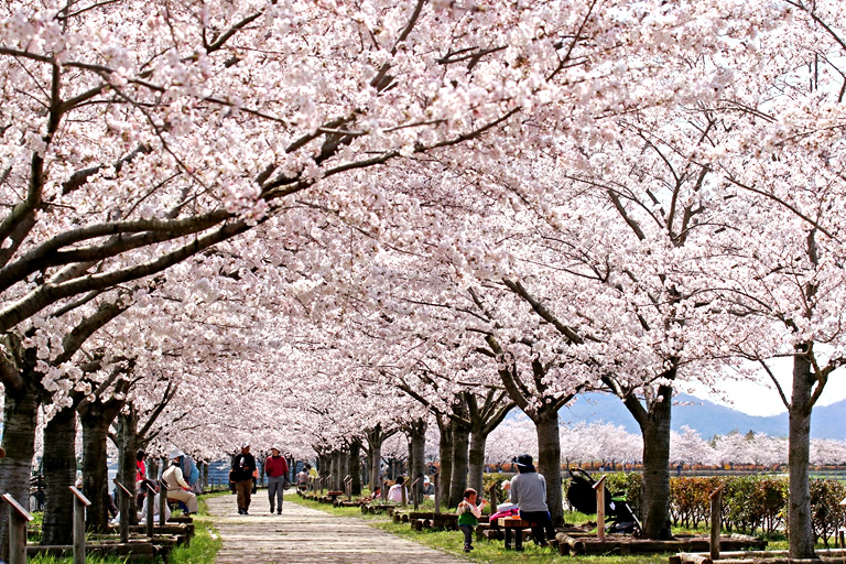 4kmにも渡って桜並木が続いているので、俳句の季語の「花の雲」のように、遠くからは白雲のように桜の花が一面に咲きつづく光景が望めます。実際に歩いてみると、満開の時期には、両側から薄紅色に覆われ、まるで桜のトンネルのようです。特にお天気の良い日には、青空と桜のコントラストが本当にキレイで、ため息が出るような幻想的な風景が広がります。