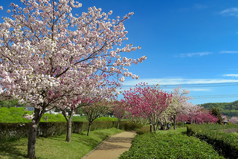 JR市場駅近く、加古川上流浄化センターから続く約850mの「桜つづみ」と呼ばれる並木道もあります。35種260本の八重桜が並んでいます。「桜づつみ」の入口には約7,000㎡の広さをもつ日本庭園「やなせ苑」もあります。見ごろは少し遅めで、4月中旬~下旬。