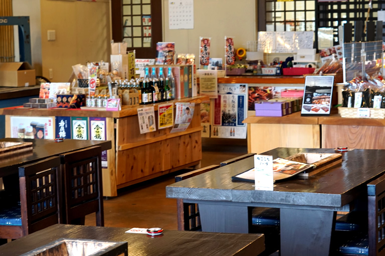 お土産物や海産物の販売もしていて、お店で買ったカニや魚介を、テーブルで炭火焼きにして食べることできます。