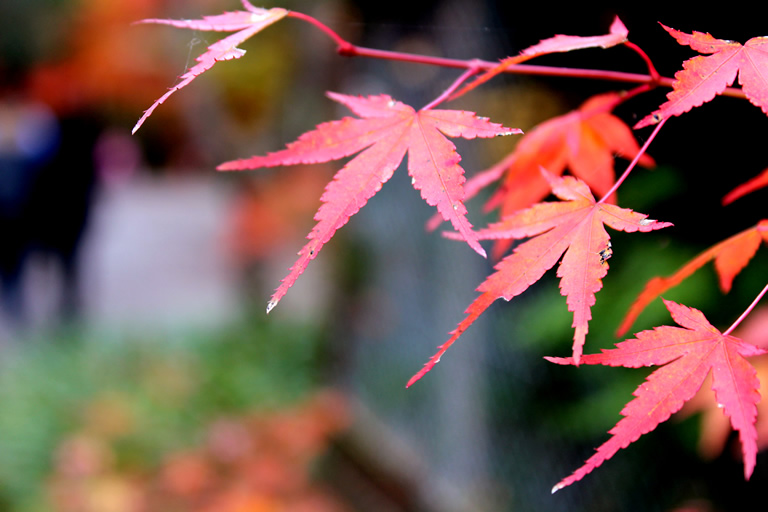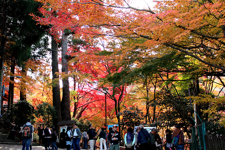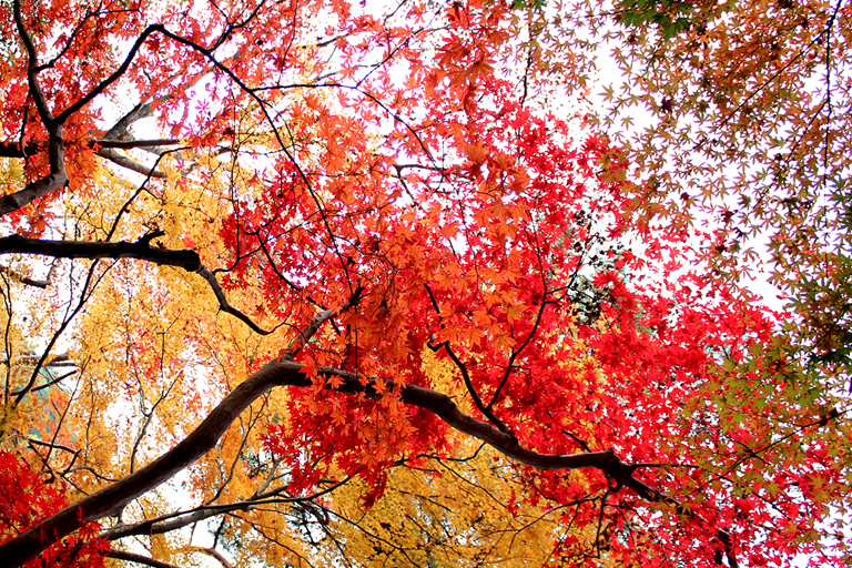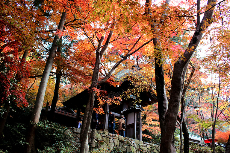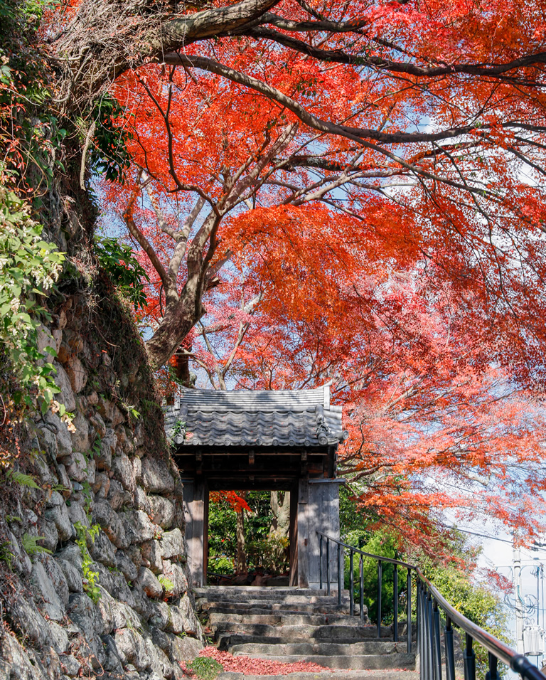 1873年に廃寺になった瑞宝寺の跡地を利用した公園で、約2500本のカエデが並ぶ園内は、11月初旬から艶やかな秋色に染まります。豊臣秀吉が「いくら見ても飽きない」と褒め称えたことから、「日暮(ひぐらし)の庭」という別名があるほど、美しい光景が広がっています。