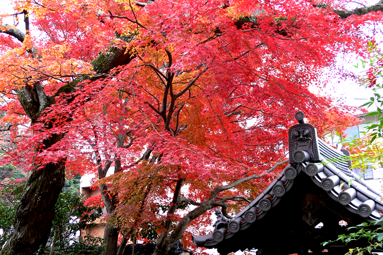 風情のある山門のすぐ先に、樹齢200年超の見事な一重のしだれ桜がそびえています。境内には赤や黄の鮮やかな点在。写真は、燃えるような赤い紅葉と鬼瓦の組み合わせです。