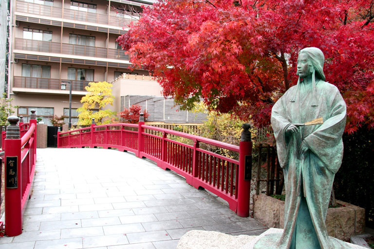 朱色の欄干が印象的な「ねね橋」の上を彩る紅葉が美しく、橋のたもとには、豊臣秀吉の正室・ねねの銅像も建っています。