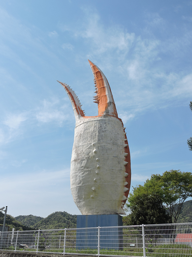 清水橋停留所から、野花が咲き誇る夢前川沿いをてくてく歩いていくこと約15分、ヤマサ蒲鉾工場のオブジェ、カニの爪がお出迎えです。