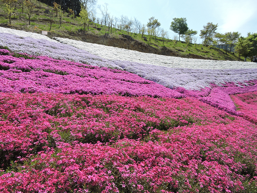 およそ6500平方メートルの敷地に、赤・ピンク・薄紫・白の芝桜約21万株が山裾に広がるようにして咲き誇っています。とても綺麗なグラデーション!