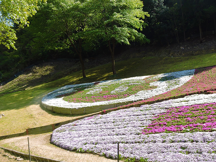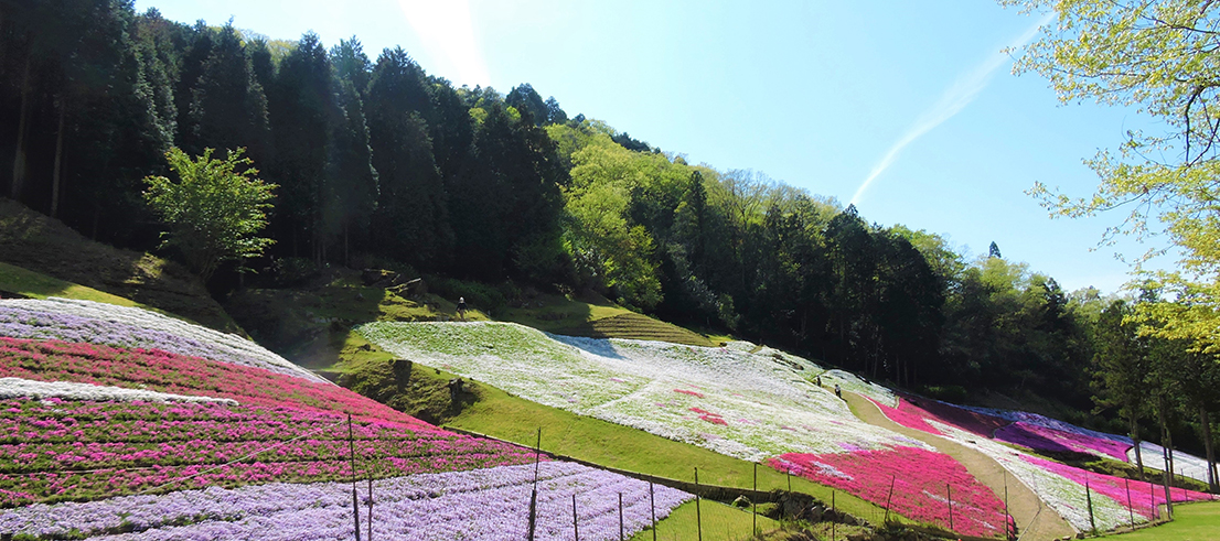 姫路駅から北へバスで30分、清水橋停留所で降りて歩くこと15分ほど、のどかな夢前町に広大で色鮮やかな芝桜を鑑賞できる場所があります。それがヤマサ蒲鉾本社工場です。