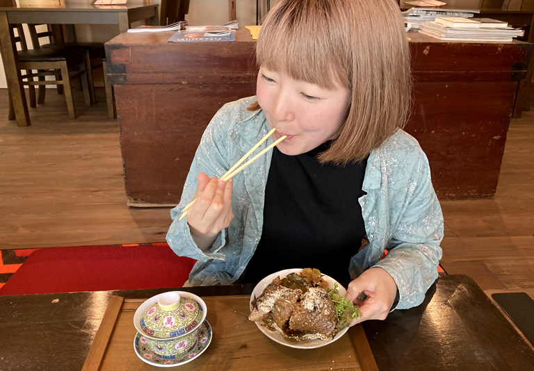 私はいつもタレときなこをたっぷりかけていただきます。付け合わせてパクチーやザーサイとも好相性。