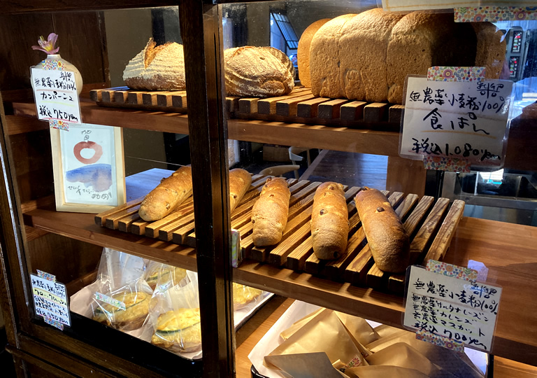 香ばしい匂いに満ちた店内には、石臼でひいた有機小麦と有機レーズンからつくった天然酵母、福住の水、そして地元産の有機野菜といった、素材に徹底的にこだわったパンが並んでいます。