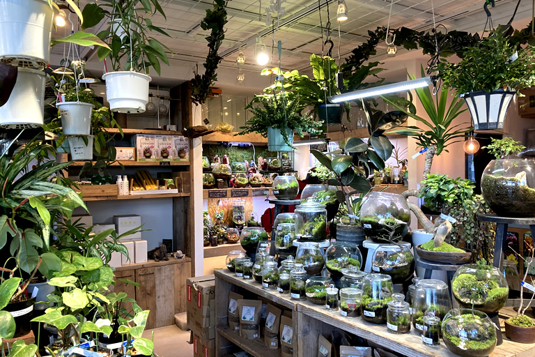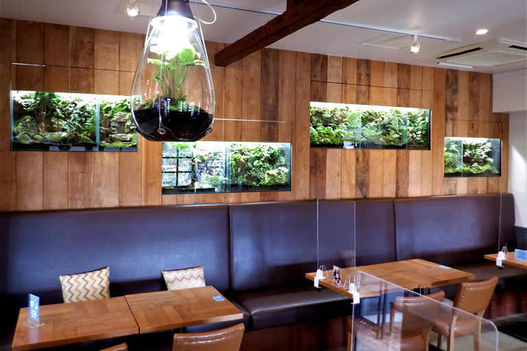 カフェの店内には、オシャレな苔テラリウムがたくさんが飾られていて、癒しの空間になっています。どれも濱嵜さんの作品。