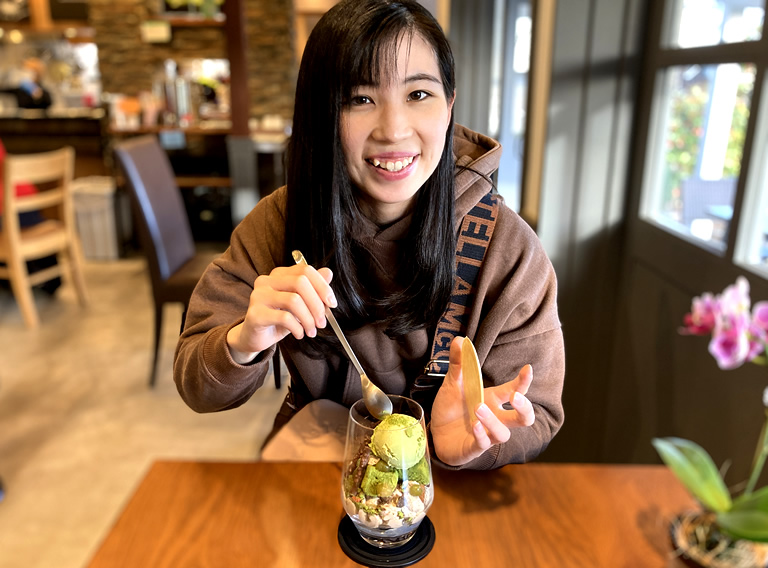 底にはオリジナルワッフル、さらに抹茶わらびもちや抹茶アイスなど、色んな食感と味が楽しめて、食べ応えも十分。パフェも付いて3,980円の制作体験はお得感たっぷりだと思います!