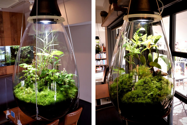 蓋をして密閉したら、後は土が乾いたら水を吹きかける程度でOK。作品によって異なりますが、水やりは数週間に一度ぐらいが目安とか。これなら初心者の私でもお世話ができそうです。