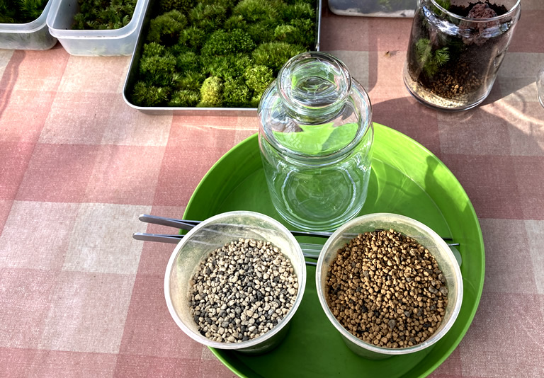 机に並んでいるのは、ガラス瓶、ピンセット、土台になる2種類の土、苔。