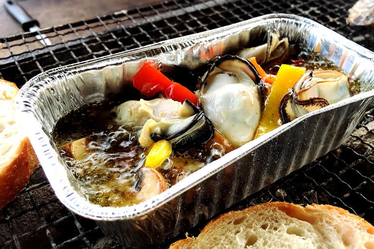 100均のアルミ容器にアヒージョのシーズニング&オリーブオイルを入れ、焼き上げた牡蠣を贅沢に投入。絶品です。