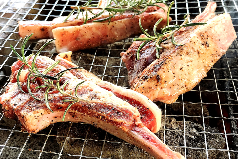 先述の友人の“味変”バリエーションは、年々バージョンアップしていて、今年のお肉はラムチョップ。炭火で焼き上げるラムチョップ、見た目通りの美味しさです。