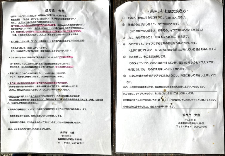 空いているテーブルに座ると、コンロと牡蠣が運ばれてきます。すごい数の牡蠣を見て、一気にテンションが上がります。牡蠣の焼き方などの説明も用意されています。