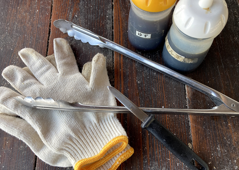用意されている道具は、軍手、トング、ナイフ。