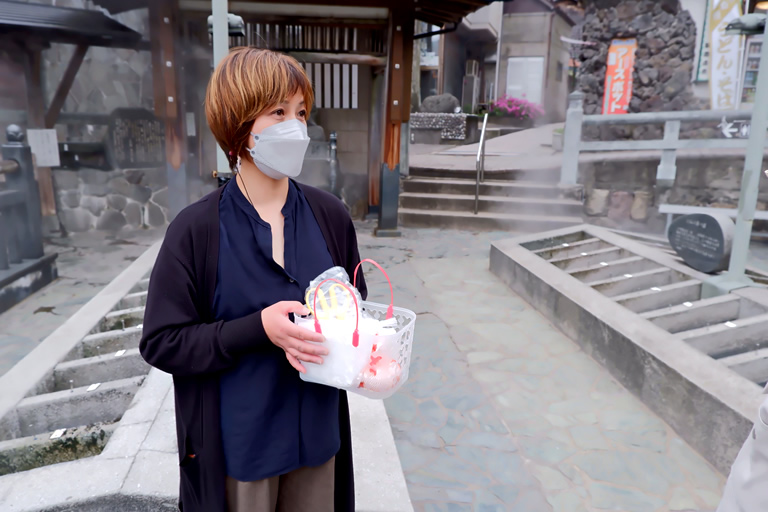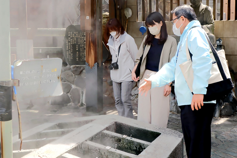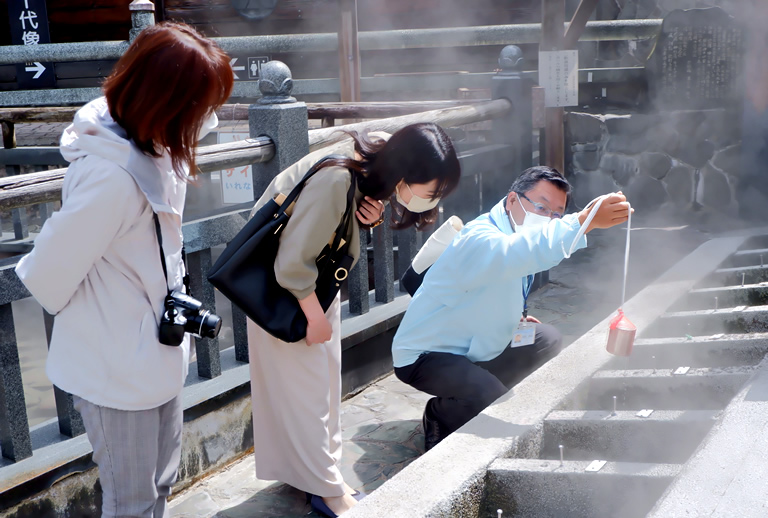 散策ツアーのメインは、温泉町の中心地、「荒湯」での「湯がき文化」体験です。