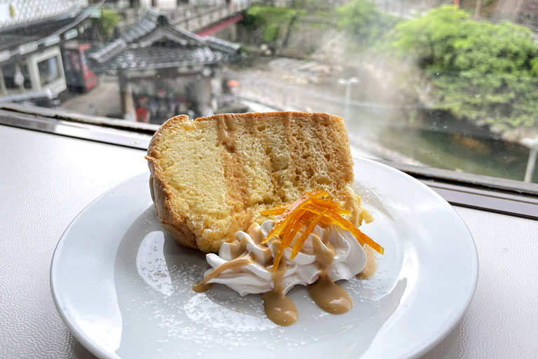 写真は、荒湯生キャラメルがたっぷりかかった「Cafe 98℃」のシフォンケーキ500円。