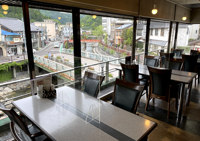 「Cafe 98℃」は、荒湯に隣接するビルの2階にあるカフェで、店内から温泉街が見渡せます。地元食材を使ったメニューが自慢で、但馬牛のローストビーフランチなど、ランチメニューもあります。