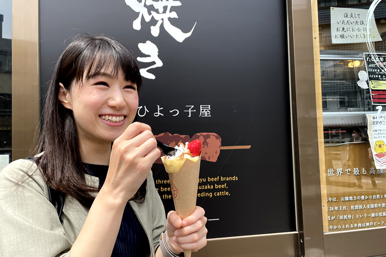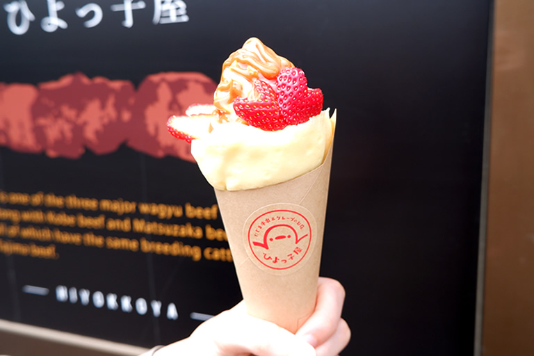 写真は、荒湯生キャラメルクレープのいちご500円。大きくて生クリームもたっぷりでボリューム満点です!