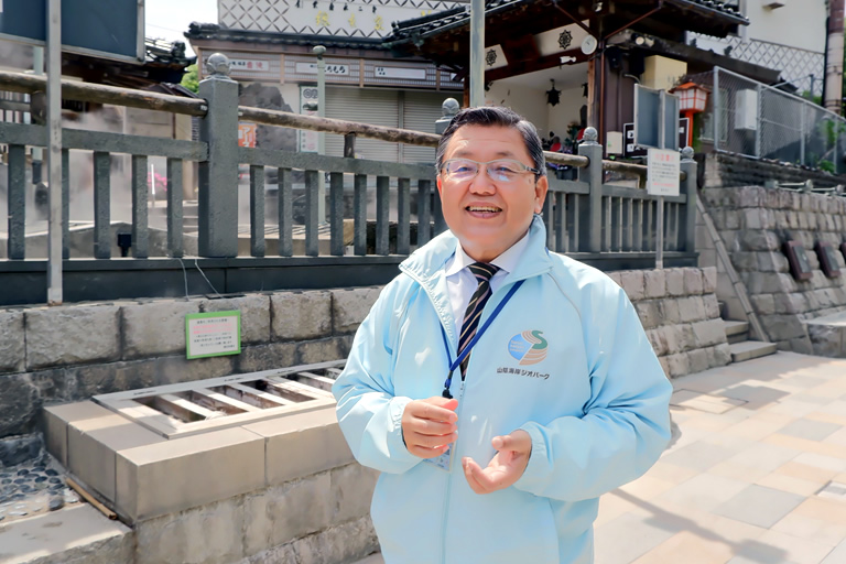 今回ガイドしてくださったのは、湯村温泉観光協会会長で、山陰海岸ジオパーク公認ガイドでもある朝野泰昌さん。なぜ「山陰海岸ジオパーク公認ガイド」なのかと言うと、湯村温泉は、ユネスコ世界ジオパークの「山陰海岸ジオパーク」に含まれているからです。