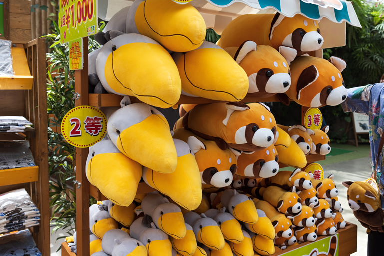 お土産コーナーでは、レッサーパンダとハシビロコウのぬいぐるみが当たるくじ引きを発見。