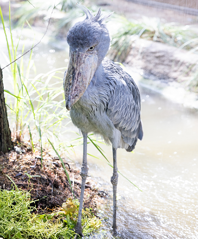 エリア全体に人工雨が降る中、雨に打たれても微動だにしないハシビロコウ。独特の風格があります。