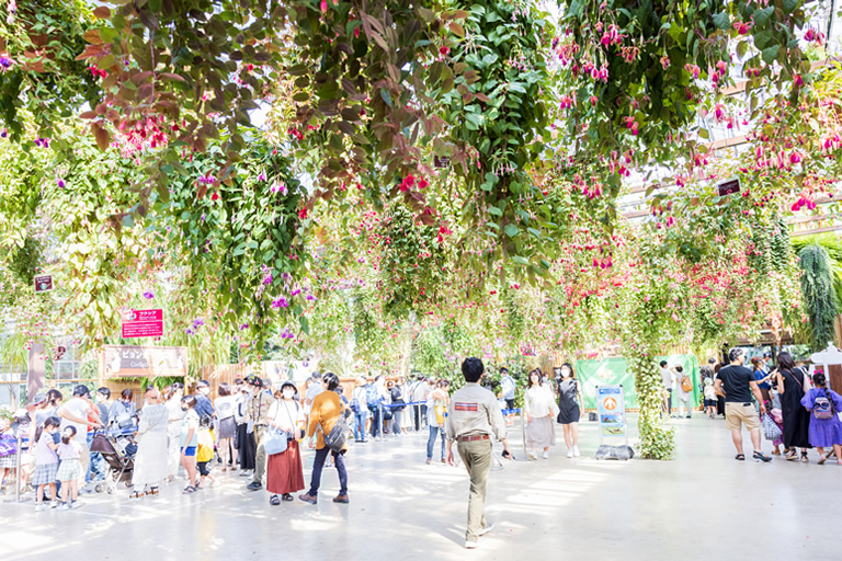 多数の花が天井から吊るされたフラワーシャワーエリアも魅力的な空間