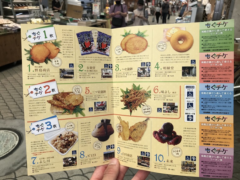 こちらの「もぐチケ」は、5枚のクーポン券がついています。必要枚数に応じたクーポン券と魚の棚商店街周辺の10店舗の中からお好きな商品を交換することができます。