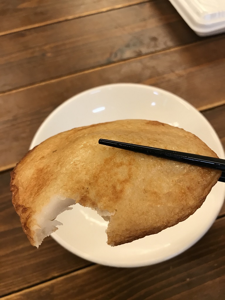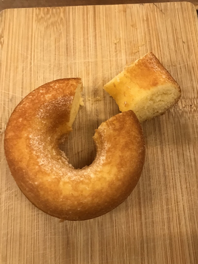 このお店で交換できる商品は『焼きどーなつ』のプレーン味もしくはとうふ味です。今回、選んだのはプレーン味です。しっとりとした食感、あっさりした甘さで手が止まらないです!