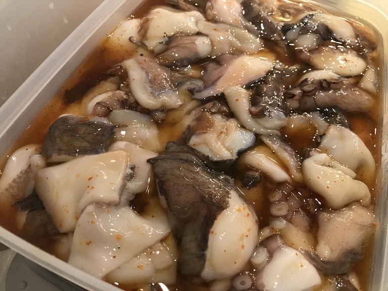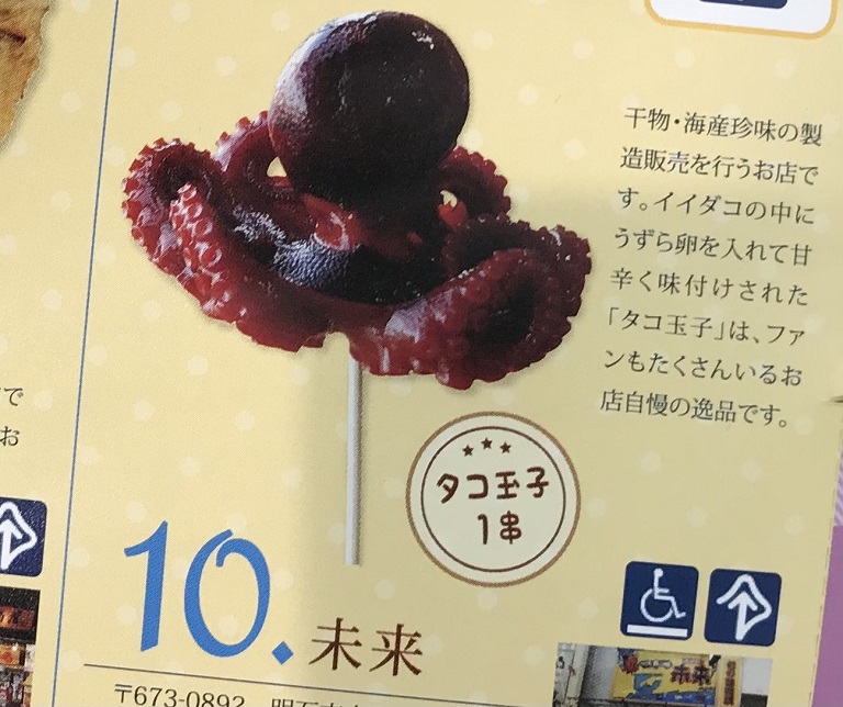 次は、珍味「タコ玉子」です。干物・海産珍味の製造販売を行うお店「未来」で交換できます。イイダコの中に甘辛く味付けしたうずら卵が入った逸品です。