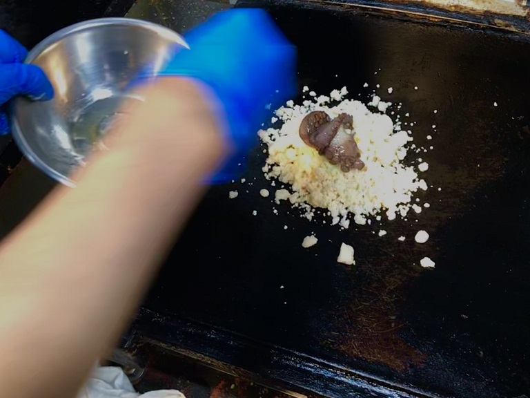 新鮮でプリプリな明石だこをチーズと特製ダレで味付けした生地の上にのせていきます。