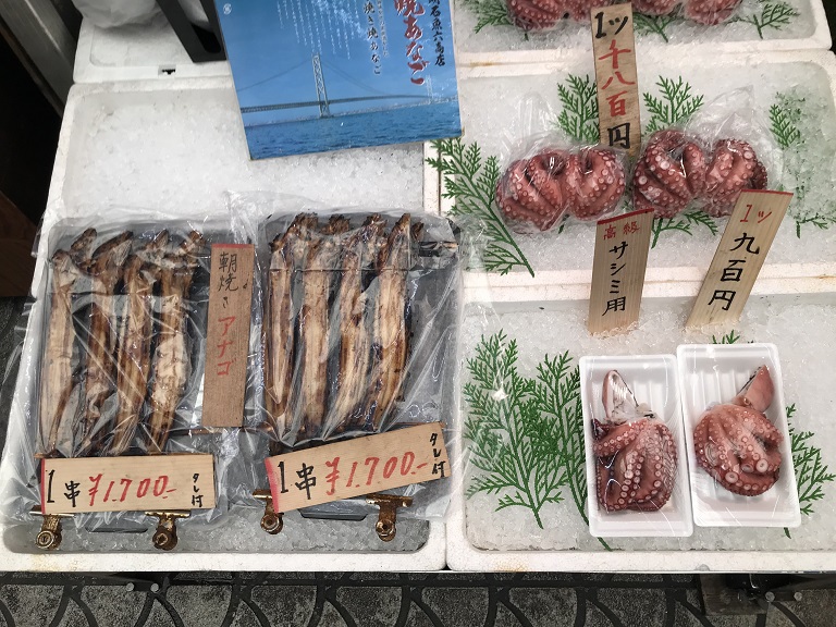 魚の棚商店街に入ったら、新鮮な魚が店頭に並んでいます。