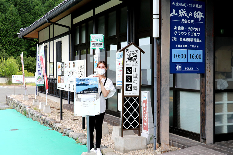 「山城の郷」正面玄関で「天空バス」に乗車。