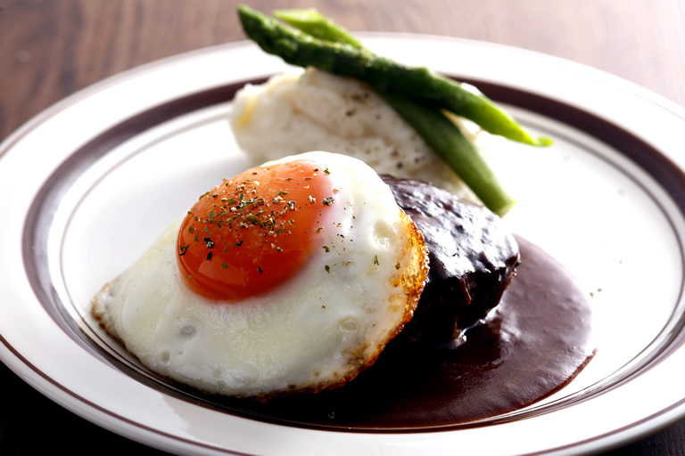 神戸ビーフと神戸ポークだけを使ったハンバーグは、肉汁がジュワーッと溢れる贅沢な味わい。写真は、兵庫県市川産のタズミの卵の目玉焼き+150円(税別)をトッピング。