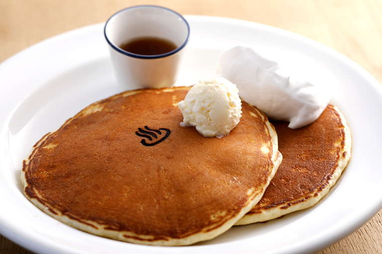兵庫県産の小麦粉を100%使用した「温泉パンケーキ」1,050円(税別)は、シンプルな美味しさ。温泉マークが旅気分を盛り上げてくれます。