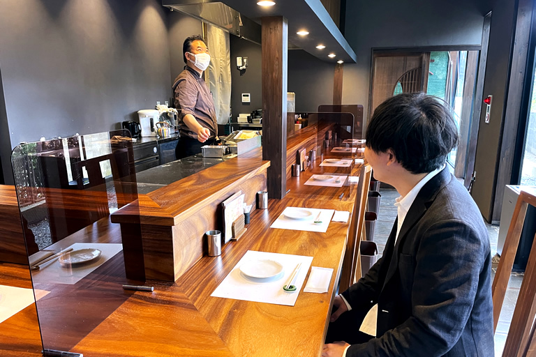 ライブ感が楽しめる長いカウンターがメインのこちらは、大阪・北新地の割烹で30年近いキャリアも持つ新宅仁志さんが、2020年12月にオープン。