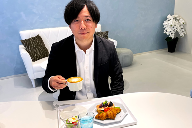 ふわとろエッグとさくさくクロワッサンと季節の果物を使ったオープンサンドに、ミニサラダとコーヒーが付いて1,500円。