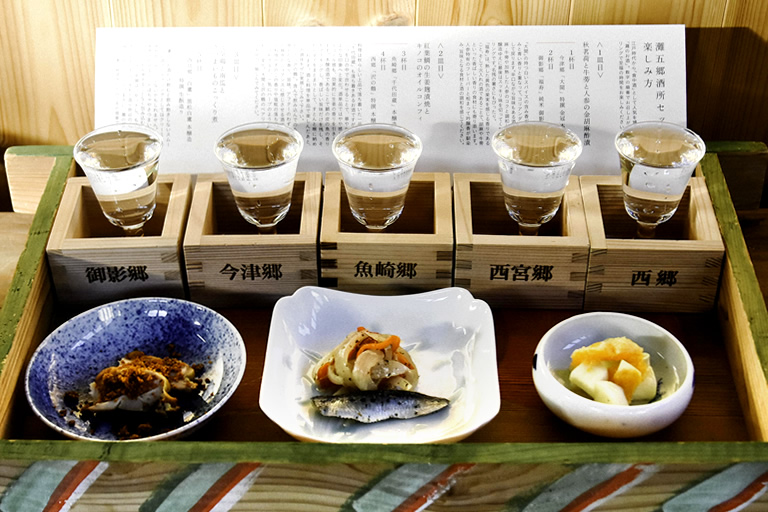 日替わりの肴3種類と、灘五郷(西郷、御影郷、魚崎郷、西宮郷、今津郷)それぞれのおすすめの酒5種類がセットになっていて、お酒と料理を楽しむ順番の解説用紙付きです。