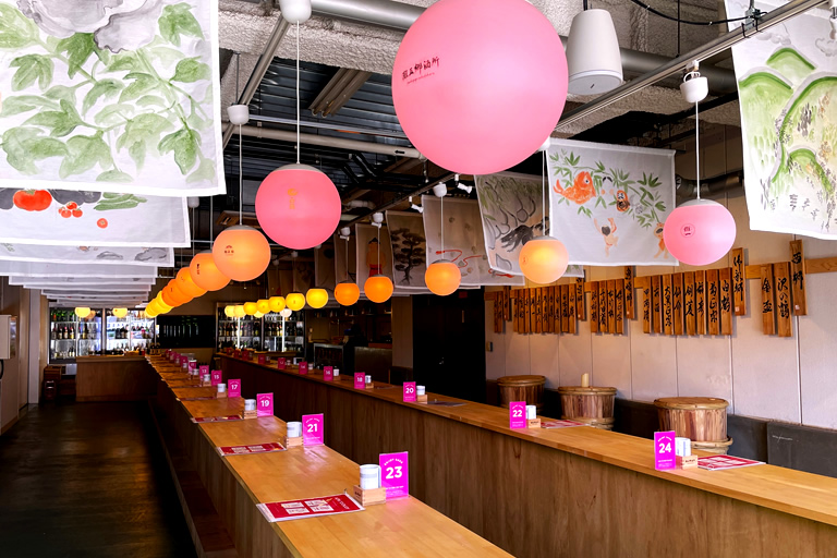 《坂野さん談》『コンセプトは“酒神社”なんです。入口にはしめ縄を飾り、世界最大級・全長50mのカウンターは本殿に繋がる参道をイメージしています』。