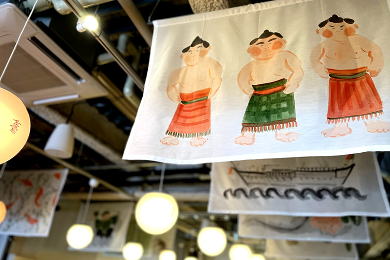 そう言われて店内を見渡すと、提灯風のライトと、八百万の神様が描かれたフラッグ(西宮在住の画家・松本尚さんの作品)がカウンターをはさむように奥まで続いています。