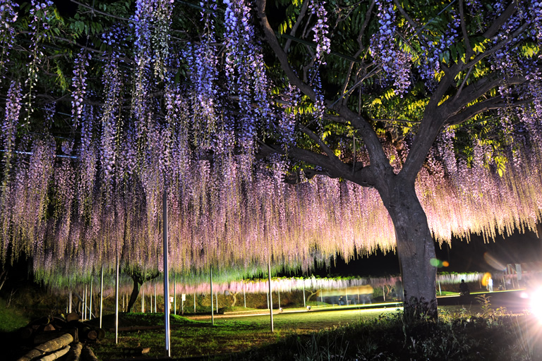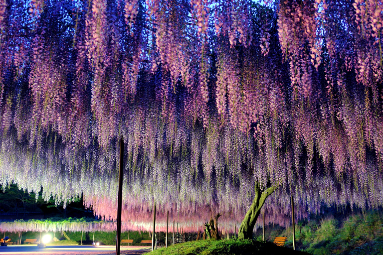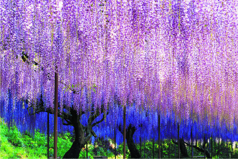 山門をくぐった本堂の右手の広場に広がるのが、幅8m、全長120mもある大迫力の藤棚。さらに上段にも全長70mの藤棚があります。