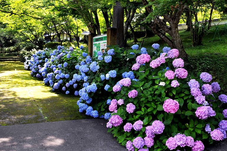 参道には100株ほどの紫陽花も植えられていて、例年6月中旬に開花。6月中旬~7月上旬頃に訪れると、紫、青、ピンク、白といった色とりどりの可憐な花が出迎えてくれます。