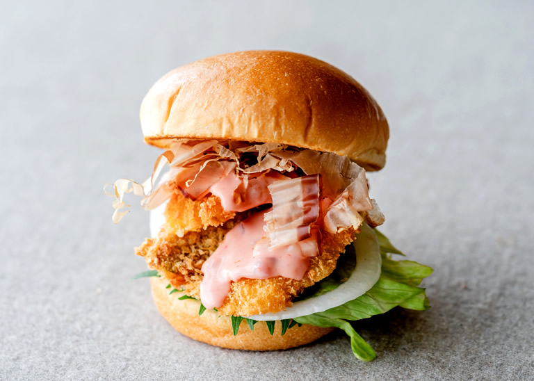 肉厚の「べっぴん鱧」を贅沢にもフライにしてサンドし、カリカリ梅とごま油の入った特製梅マヨソース、鰹節と大葉の風味であっさりと食べられます。