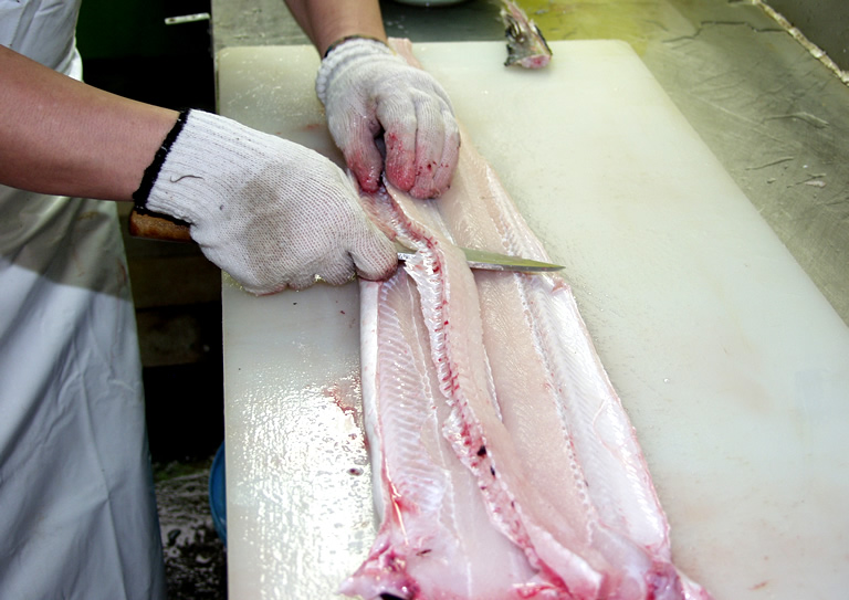 漁場海域は、鱧の住処となる海底が非常に細かい粒子の砂地になっているので、腹の皮が擦れず薄くて柔らかいんです。あと、潮流の影響で程よく身が引き締まり、甲殻類などの餌が豊富なエリアでもあるので、身質もすごく良い』。