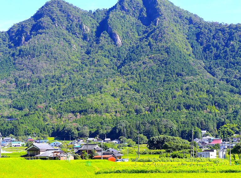 三尾山の麓に広がる農村の原風景と、鮮やかに輝くひまわりの組み合わせは、懐かしさがこみ上げる夏ならではの絶景!