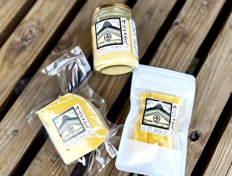 下の写真は、「蔵熟成ゴーダ」ブロックタイプ(100g前後)1,200円、カットタイプ(45g以上)600円、粉チーズ‘95g)1,300円。※すべて税込み