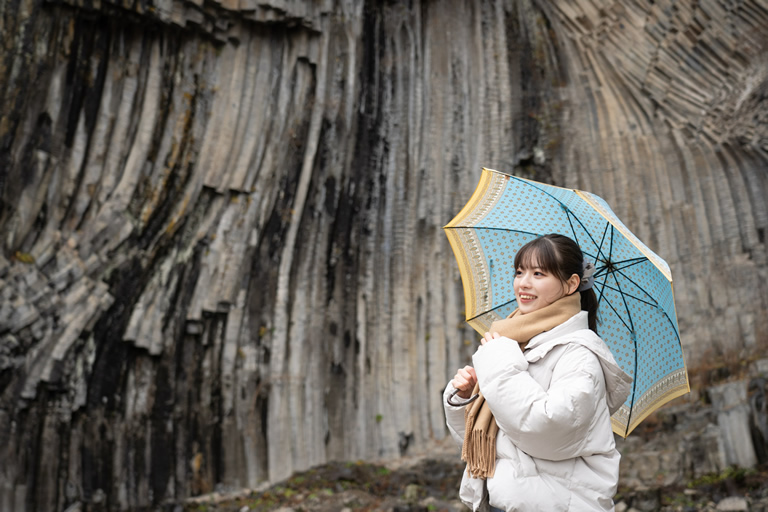 公園内の地形は、約160万年前の火山噴火で流れ出た溶岩が固まったもの。園内には5つの洞があって、その内「玄武洞」と「青龍洞」は国の天然記念物に指定されています。