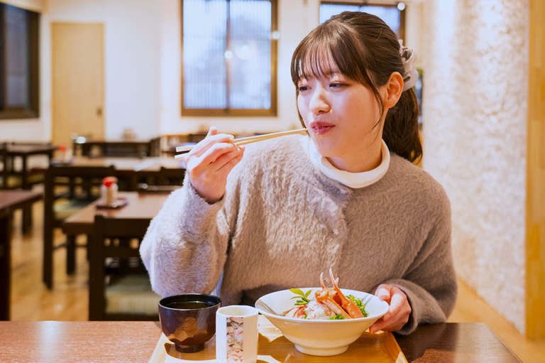 今回、私が頂いたのは、地元・香住漁港で水揚げされた香住ガニを丸ごと一杯つかった「香住ガニ丼」。漁地元で獲れたばかりの新鮮なカニの身が贅沢に盛られ、カニ味噌もたっぷりで、2,700円(税込)と嬉しいお値段! ※数量限定、香住ガニ漁が行われる9月~5月の期間のみのメニュー。
